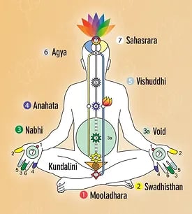 On the left you will see what is known as a Chakra Chart this is primarily a map of our Subtle System. Chakras are energy points. We have a left, right and central channel. The left side which looks after our emotions and past and is ruled by the Moon.